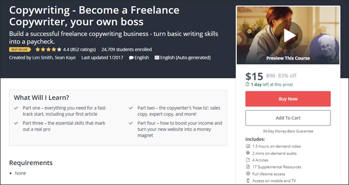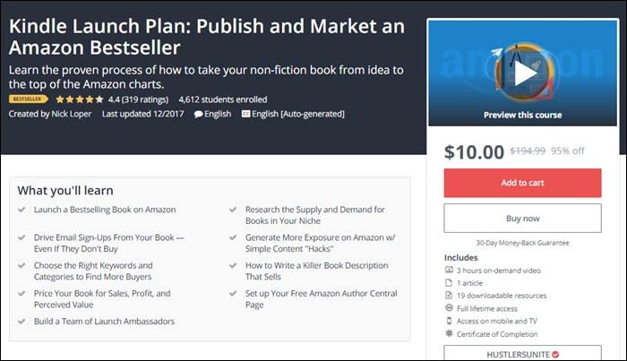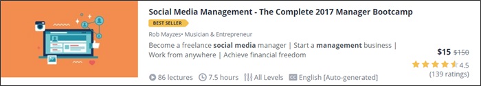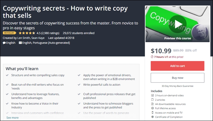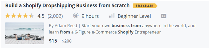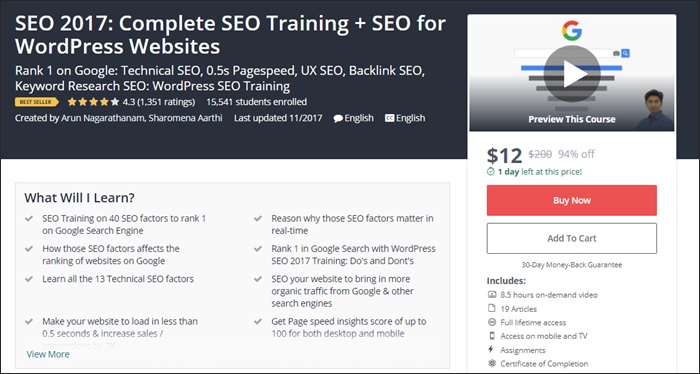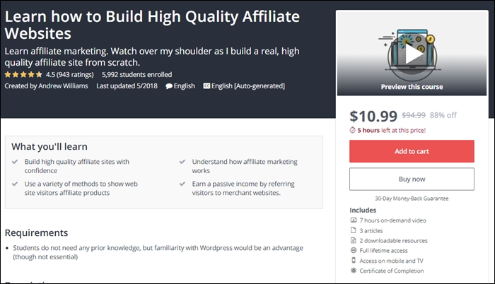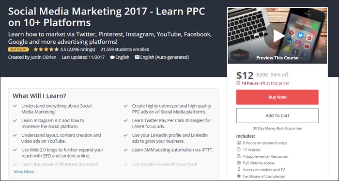 Sample Review: “This course offers valuable, actionable advice. The instructor actually seems to want to help you, unlike other digital marketing courses where instructors put a lot of emphasis on promoting themselves and their affiliate products.”