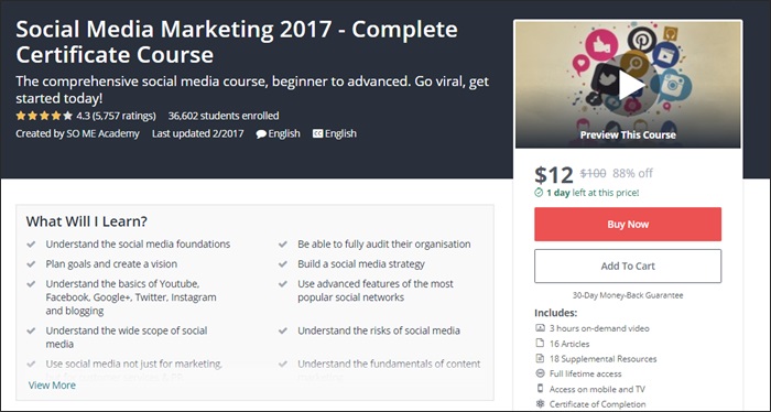 Sample Review: “As the name suggests, the course covers almost all the basic fundamentals of Digital marketing. A must-have course for aspiring digital marketers. I even recommend the course to those not related to the marketing stream.”